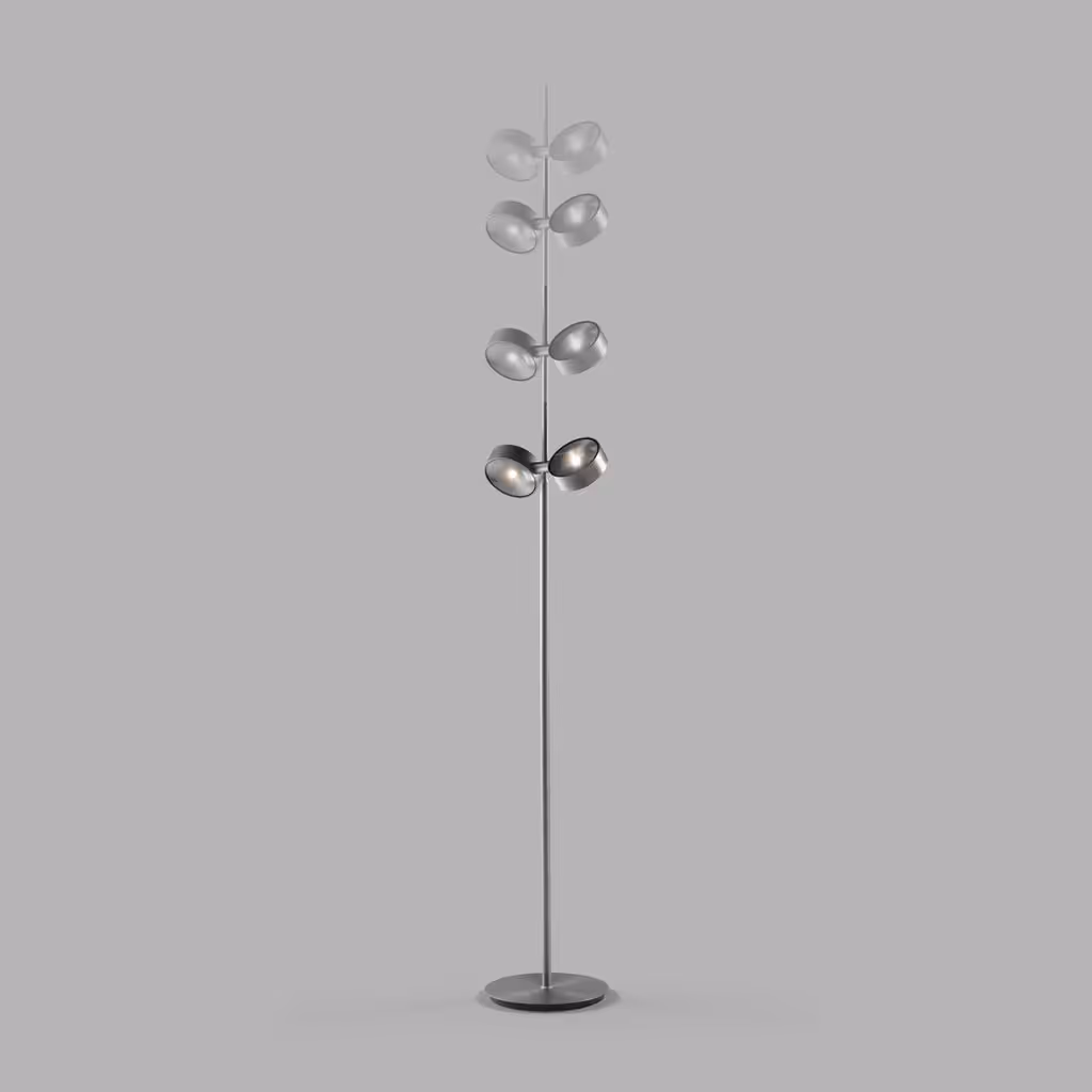 ORBIT is an indoor floor lamp that works optically, spreading light further, wider, and more softly. The optic glass lens provides a glare-free light, eliminating annoyance to the eyes while providing maximum light where needed. The ORBIT Floor lamp can be operated by the touchless sensor to turn the light on/off and adjust the light intensity. Both spots can be controlled independently from one another, thus allowing users to shape their light. Titanium is our latest colour invention: A soft grey with an industrial sharpness. The effect derives from the delicately brushed Aluminium surface. The Titanium colour has a deep reflective tone, appearing dark and light depending on where you stand to look at the product.