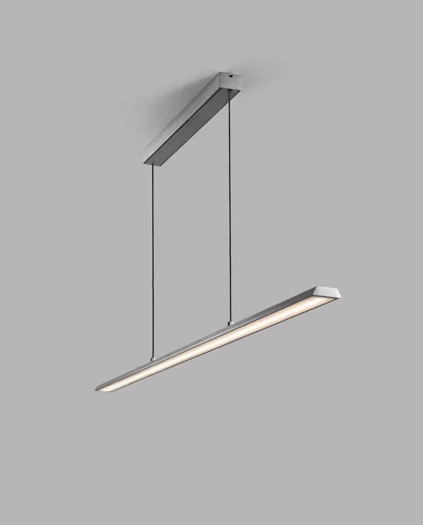 SLIM pendant from LIGHT-POINT is an elegant, discreet, and efficient light source, ideal for use over, for example, dining or meeting tables. Suspended like a trapeze on two thin fabric cables and with a discreet bracket, it effectively casts a soft, warm, and diffused light over any surface it illuminates. SLIM pendant is available in several colors and in three lengths: 120 cm, 150 cm, and an impressive 180 cm. With two built-in color temperatures, you can choose between 2700K and 3000K using the switch in the installation base. The lamp, equipped with the best and most compact LED technology, is only 1 cm thick and 5 cm wide and made of aluminum. Thus, SLIM pendant does not disturb the view through window or door openings. It provides tranquility to the eyes and space for life.
